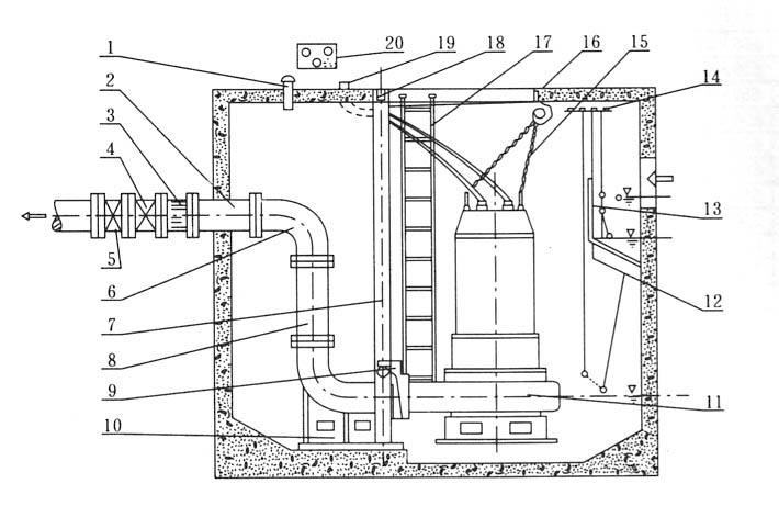 1.通風(fēng)節 2.預埋(mai)管 3.膨脹(zhang)節 4.逆止(zhǐ)閥 5.閘閥(fá) 6.彎管 7.導(dǎo)軌 8.出水(shui)管 9.支架(jia) 10.耦合底(dǐ)座 11.自動(dòng)攪勻排(pái)污泵
