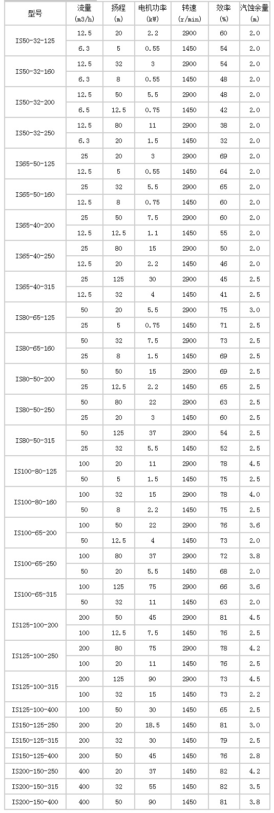 IS單級(ji)離心泵的(de)性能參數(shu):