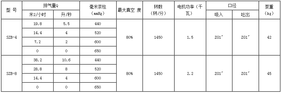 SZB水環式真空泵目前制造的本型号泵有:SZB-4、 SZB-8。其中4(8)表示當水銀柱高為520毫米時的氣量(升/秒)。">