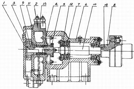 8. 聯軸(zhóu)器 9.葉輪(lún)平健 10.泵(bèng)軸 11.填料(liào)環 12.軸承(cheng)壓蓋 13.法(fǎ)蘭盤 14.聯(lián)軸器平(ping)健
