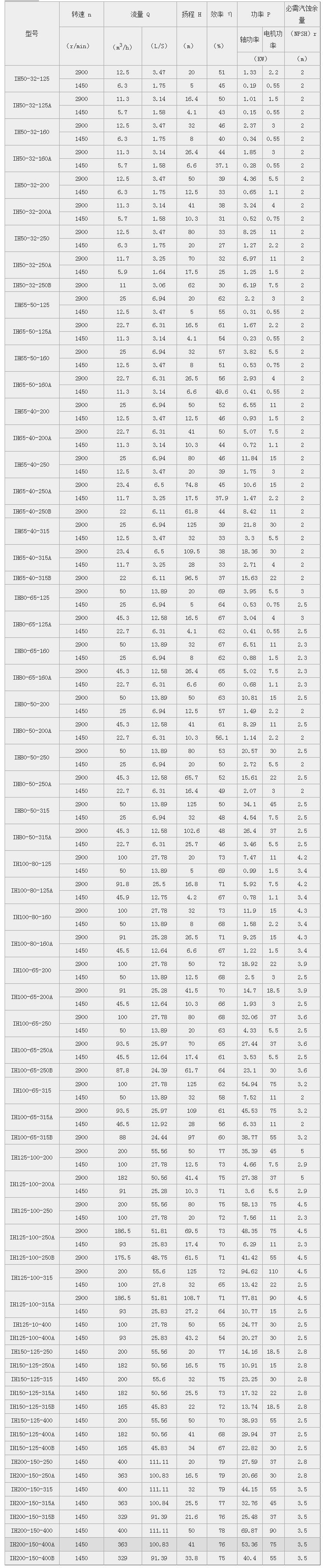 技(ji)術參數: IH型卧(wo)式耐腐蝕化(hua)工泵