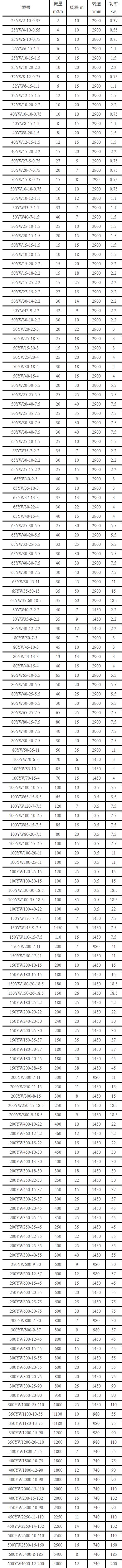 YW無堵塞(sāi)液下排(pai)污泵性(xìng)能參數(shu)表